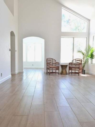 Ele é uma opção ótima pra quem quer um ambiente bem claro, com poucas linhas de rejunte, fácil de instalar, alta resistência. Mesmo sendo um piso frio. Há dois tipos no mercado, o porcelanato técnico (feito de massa porcelânica, com acabamento polido, não polido ou texturizado) e o porcelanato rústico (recebe uma cama de esmalte sobre a massa porcelânica e não tem o mesmo desempenho do porcelanato técnico). Prós: Impermeável, durabilidade longa e resistência a abrasão. Contras: Instalação demorada e preço. Manutenção diária: Varrer, pano úmido e suporta produtos de limpeza básicos. Só precisa evitar produtos a base de ácido. Valor médio: R$ 90 a R$ 380 o m².- Porcelanato imitando madeira, também é uma opção.