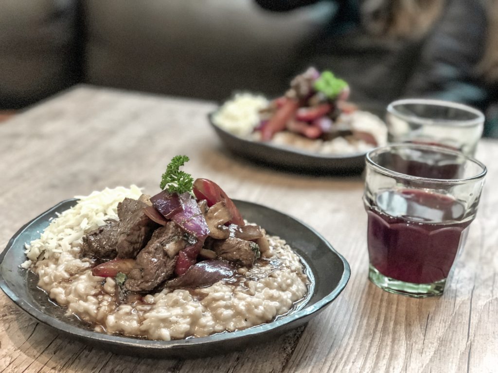 Risoto de Lomo Saltado (R$38): risoto cremoso cozido “al dente”, servido com lomo saltado (tiras de filé salteadas com cebola roxa, tomate, alho e coentro) e cogumelos ao “fogo vivo”.