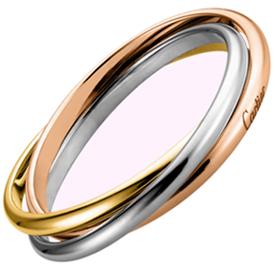 1924 – Anel TRINITY. Criado em parceria com o artista plástico Jean Cocteau para um amigo de Cartier. Três alianças entrelaçadas em três tons de ouro: branco para a amizade, amarelo para a fidelidade e rosa para o amor.