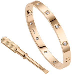 1969 – LOVE BRACELET é criado pela CARTIER de Nova York, obra do designer Aldo Cipullo. A peça foi inspirada em uma prática medieval: guerreiros antes de saírem para batalhas, muitas vezes “trancavam” suas esposas com cintos de castidade de ferro pra mantê-las fiéis. O designer então teve a ideia de criar um símbolo moderno dessa tranca e desenhou uma pulseira com parafusos, que vinha com uma pequena chave de fenda pra abrir e fechar.